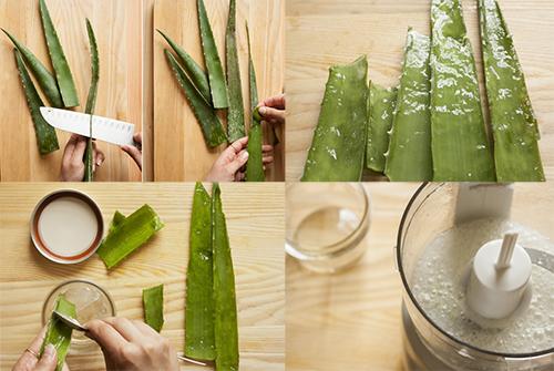 The leaves will be hung point side up allowing the yellow latex sap to drain from the end where the leaf has been cut from the plant. All the latex should be drained in about 10-15 minutes. Discard the yellow latex sap as it is bitter. Then slice the leaf open and scoop out the clear gel. This gel is what you will add to the blender.