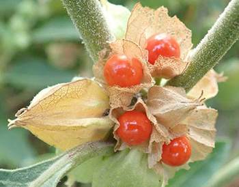 | Fruit | Small, round, red berries surrounded by a papery calyx which darkens to brown | Small, round, yellow berries surrounded by a strong, membranous calyx |