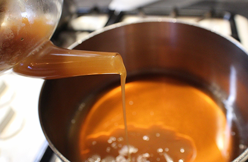 Step 7. Turn the heat on to medium-low. Cook the mixture while stirring often until it reaches about 300 degrees Fahrenheit on a candy thermometer or until it turns completely hard when dropped into a bowl of ice water. It took me about 40 minutes to reach the desired texture. It’ll be very frothy right before it’s ready.
