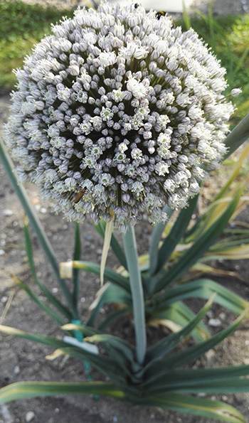 - Flowers. Leeks also grow lovely flowers at the end of their seeding phase that grows in a pom-pom-like cluster. These spherical flowers have a white papery coating in the head that will eventually sprout tiny purple flowers.
