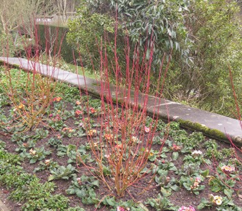 form 2-to-3-inch flat umbels at stem tips which bloom in early spring in May to June. - Stem: Bright red twigs when young, with color darkening with maturity.