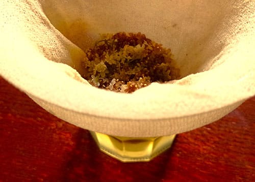 - Now it’s time to strain the flowers for the last time. Using a funnel and muslin, strain the final mixture carefully into the tincture bottle.